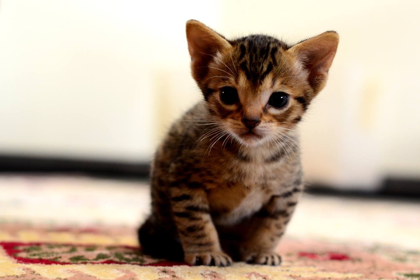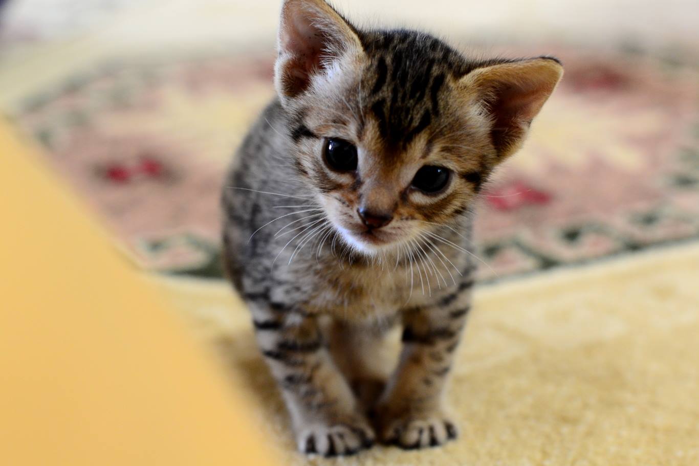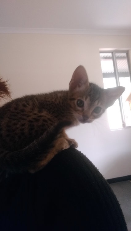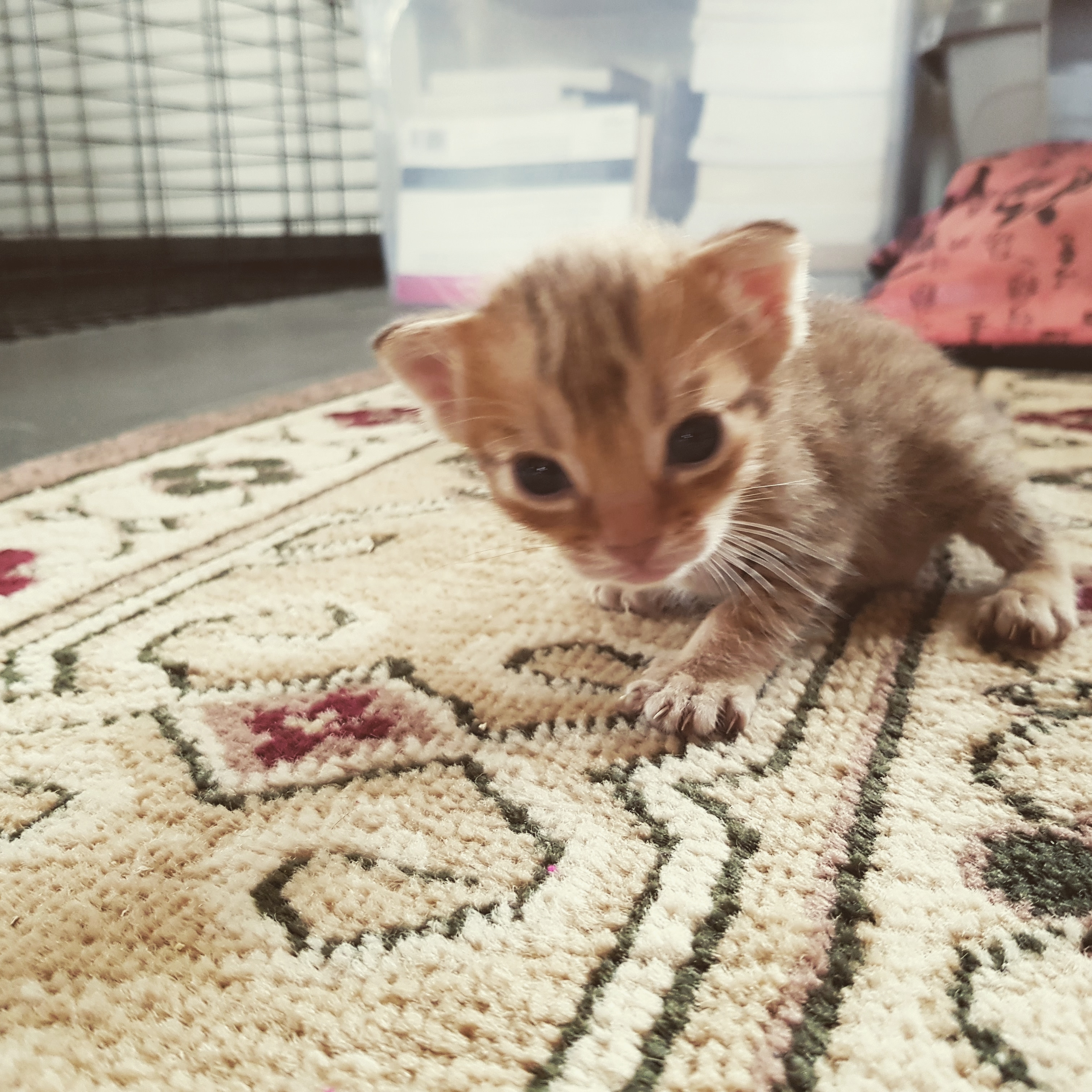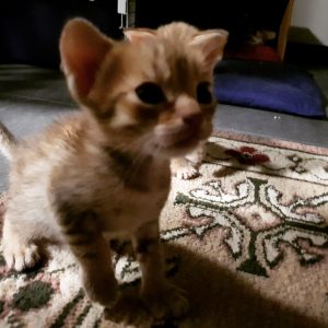 Alpha is getting so big! He’s losing his kitten fuzz, and starting to show his adult colours, with sharply defined black spots on a sandy, tawny coat. His eyes are open, now, too, and he’s starting to track movement and shapes. His little kitten purr is the cutest thing.