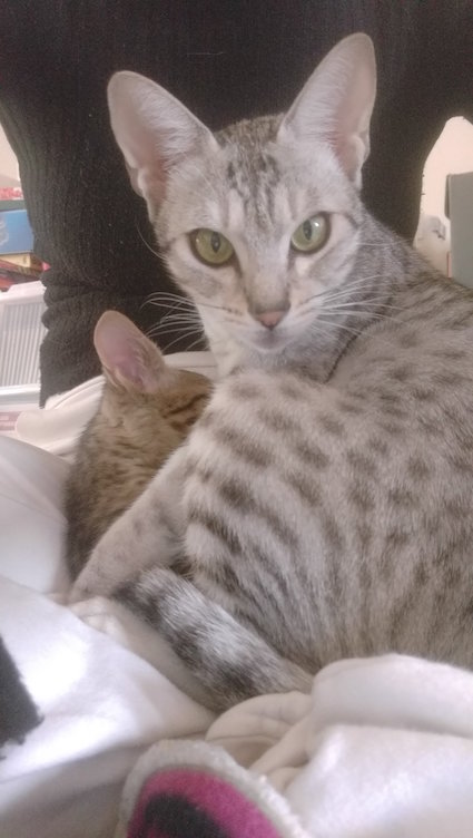 Little Alpha (named Felix by his new parents) has had his first vaccinations, and is looking super cute. He’s growing into a really cuddly lapcat, when he’s not running around playing. 🙂 He’s also learning to be a shoulder-cat, learning from his mama.