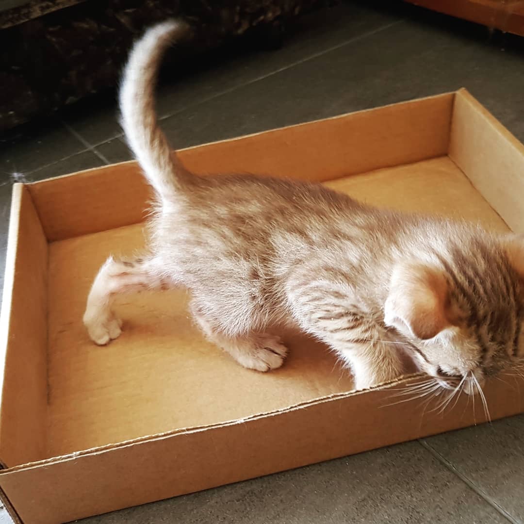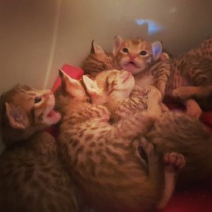 Born 5th Feb 2018 to George (Ozspots Pennyroyal) and Poccy (Falconblade Poccy Cadbury Night Hawk), six beautiful chocolate kittens – five spotted, and one marbled (classic pattern, or jungala). They are so adorably cute I just don’t have words. 🙂