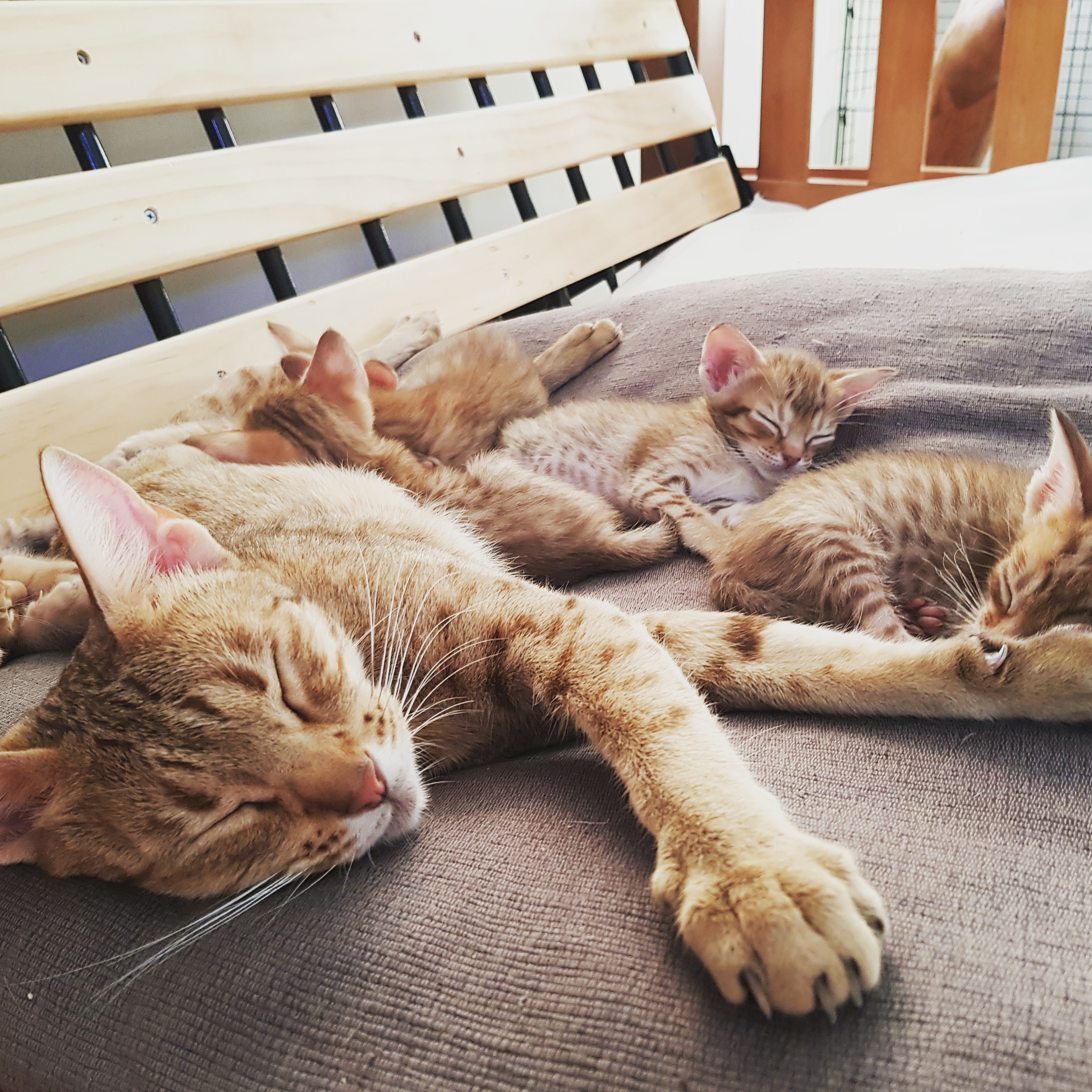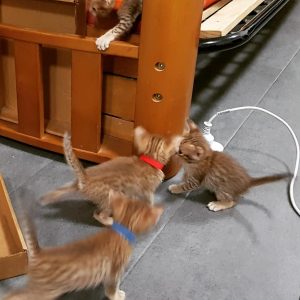 All six kittens are doing really well, toddling around and learning to play – and complaining loudly when their mum decides that playtime is over and they should really be napping now. She does eventually get them to settle down and sleep occasionally though.