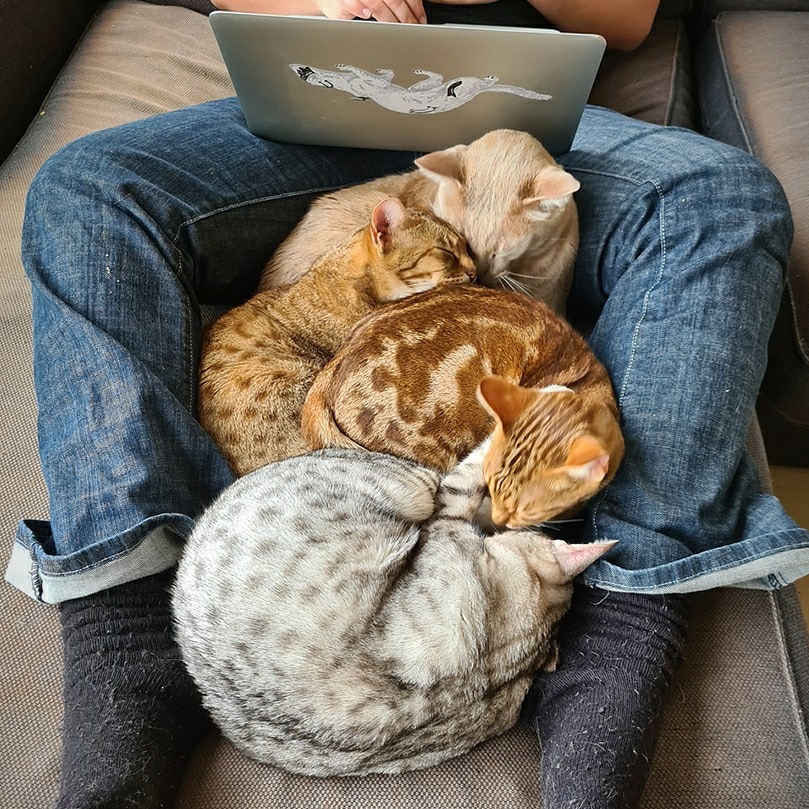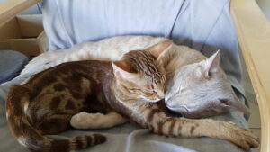 Pennyroyal (home name: George) is now retired from stud duties, and is very happy being a lapcat and playing with the kittens in the house. He’s the sweetest teddy bear of a cat, and his favourite place is curled up next to us wherever we are. Once more, we have to thank Nola Kim of Ozspots for trusting us with her ocicat lines.